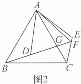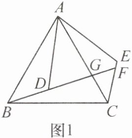 14. 如图 1,$ D $ 为等边三角形 $ ABC $ 内一点,将线段 $ AD $ 绕点 $ A $ 逆时针旋转 $ 60^{\circ} $ 得到 $ AE $,连接 $ CE, BD $ 的延长线与 $ AC $ 交于点 $ G $,与 $ CE $ 交于点 $ F $.