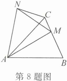 8. 如图,在△ABC 中,AB = AC.若 M 是边 BC 上任意一点,将△ABM 绕点 A 逆时针旋转得到△ACN,点 M 的对应点为 N,连接 MN,则下列结论一定正确的是 (