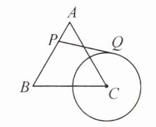 15. 如图,等边三角形 ABC 的边长为 4,⊙C 的半径为√{3},P 为 AB 边上一动点,过点 P 作⊙C 的切线 PQ,切点为 Q,则 PQ 的最小值为