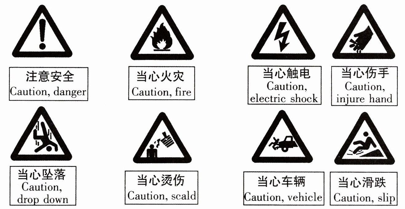 三角形的标志传达给我们的是“注意、当心”的意思,叫作“警告标志”。当你看到这样的标志时,就一定要当心了,并且要注意观察一下周围的环境,避免可能会发生的危险。说说下面的标志提醒我们要注意什么。