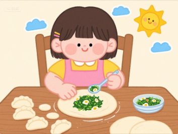 每次吃饺子的时候,我都会和爸爸妈妈一起包,大家一边包一边聊天,特别开心。这就是我最喜欢的美食,你们喜欢吗?