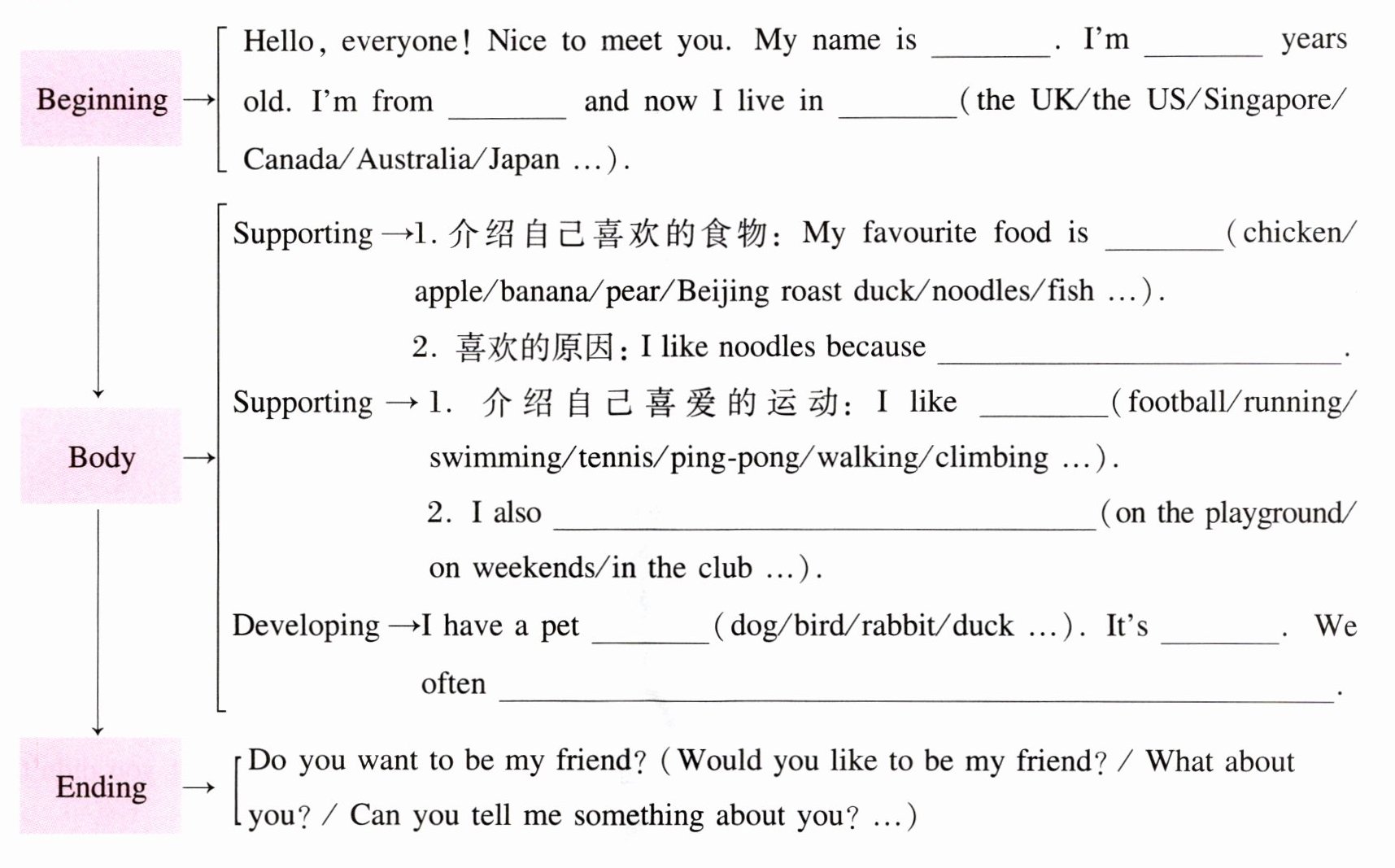 Body→{Supporting→1. 介绍自己喜欢的食物:My favourite food is
