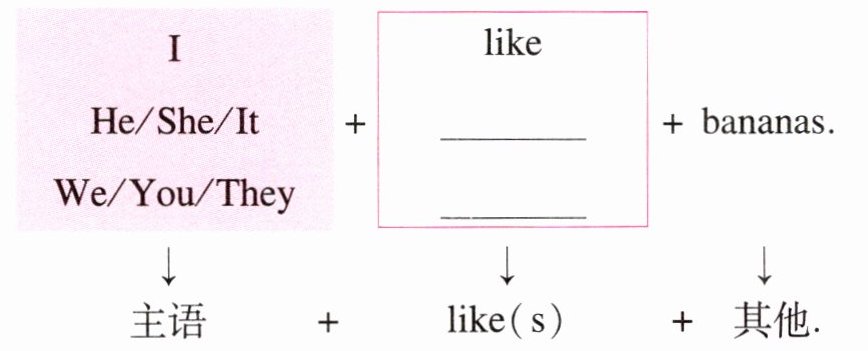 归纳 当主语是 I/We/You/They 时,用 like;当主语是 He/She/It 时,用 likes。