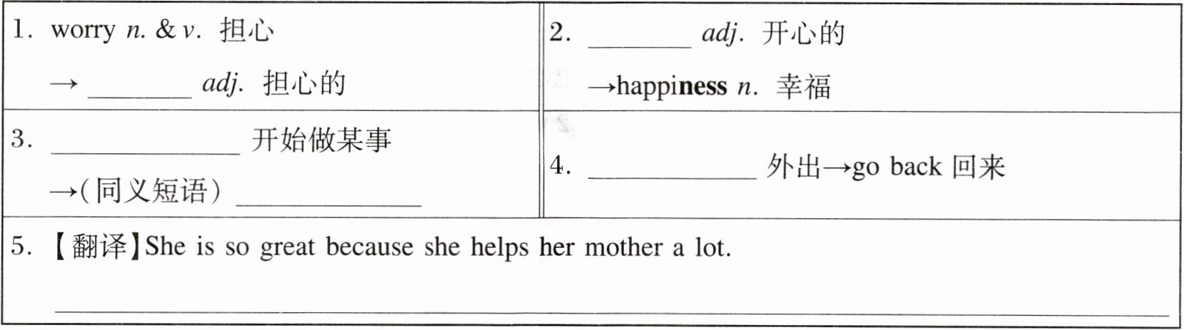外出→go back 回来||5.【翻译】She is so great because she helps her mother a lot.