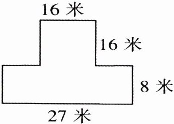 面积:该组合图形面积等于长$27$米、宽$8$米的长方形面积加上边长$16$米的正方形面积。根据长方形面积公式$S_1 = ab$($a = 27$米,$b = 8$米),正方形面积公式$S_2=a^{2}$($a = 16$米),$S=27×8+16×16=216 + 256=472$平方米。