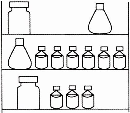 如下图:仪器架的上、中、下三层都放着酒精,每层都正好是 900 克。其中上层放着 1 个大瓶和 1 个中瓶,中层放着 1 个中瓶和 6 个小瓶,下层放着 1 个大瓶和 3 个小瓶。问大、中、小三种瓶各能装酒精多少克?(不计瓶子本身重量)
