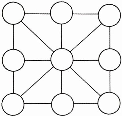 把1~9九个数字分别填入小圆圈内,使每条直线上三个数相加的和等于15。