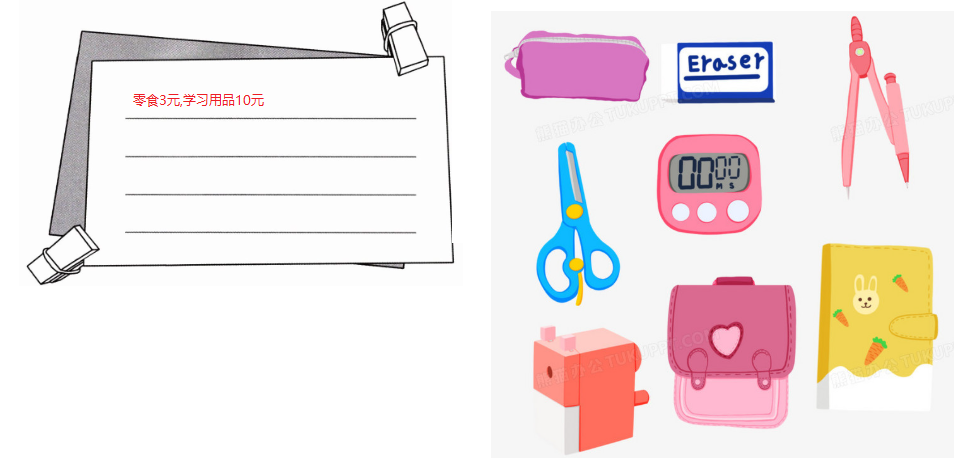 亲爱的同学们,在快乐的暑假生活里,爸爸妈妈会给你一些零花钱,让你买自己喜欢的零食或玩具,但是那些钱都是爸爸妈妈辛勤工作换来的,所以我们一定不要乱花钱。请用图文并茂的形式,记录一下最近自己买的东西,养成记账的好习惯。