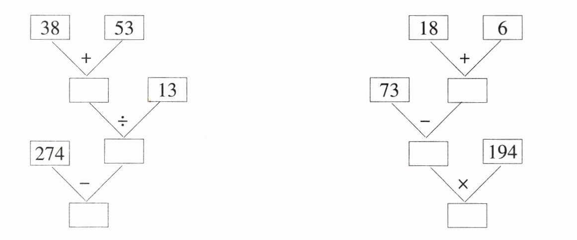故答案依次为:$91$,$7$,$267$,$274-(38 + 53)÷13$;$24$,$49$,$9506$,$(73-(18 + 6))×194$ 。