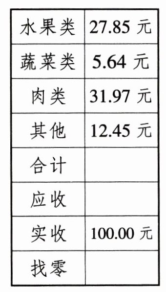 所以合计$77.91$元,应收$77.91$元,找零$22.09$元。算式分别为:合计$27.85 + 5.64+31.97 + 12.45=(27.85 + 12.45)+(5.64 + 31.97)=40.3 + 37.61 = 77.91$;找零$100-(27.85 + 5.64+31.97 + 12.45)=100 - 77.91 = 22.09$。