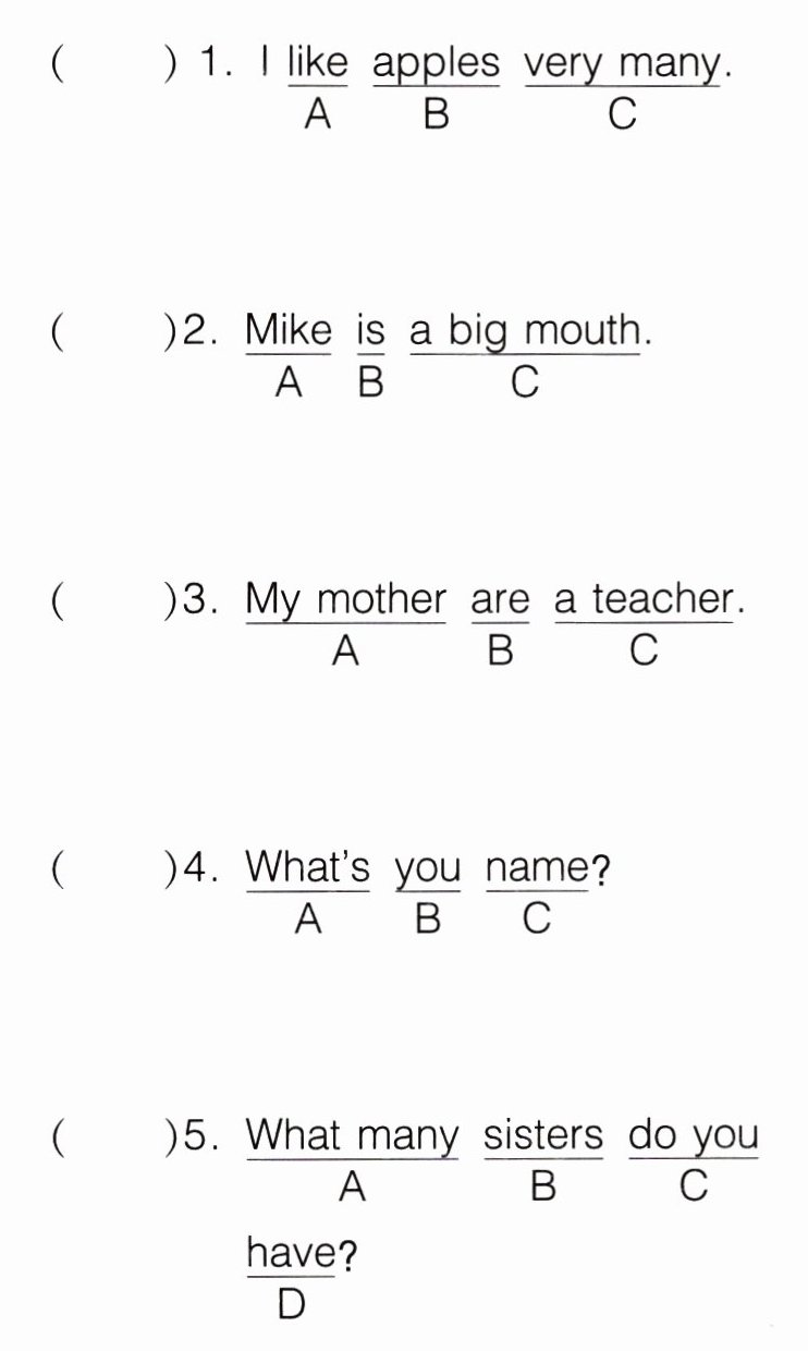 下列各句中均有一处错误,请找出来并将序号填入括号内。