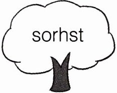 判断每棵小树上的字母重组后是哪个词,写一写。