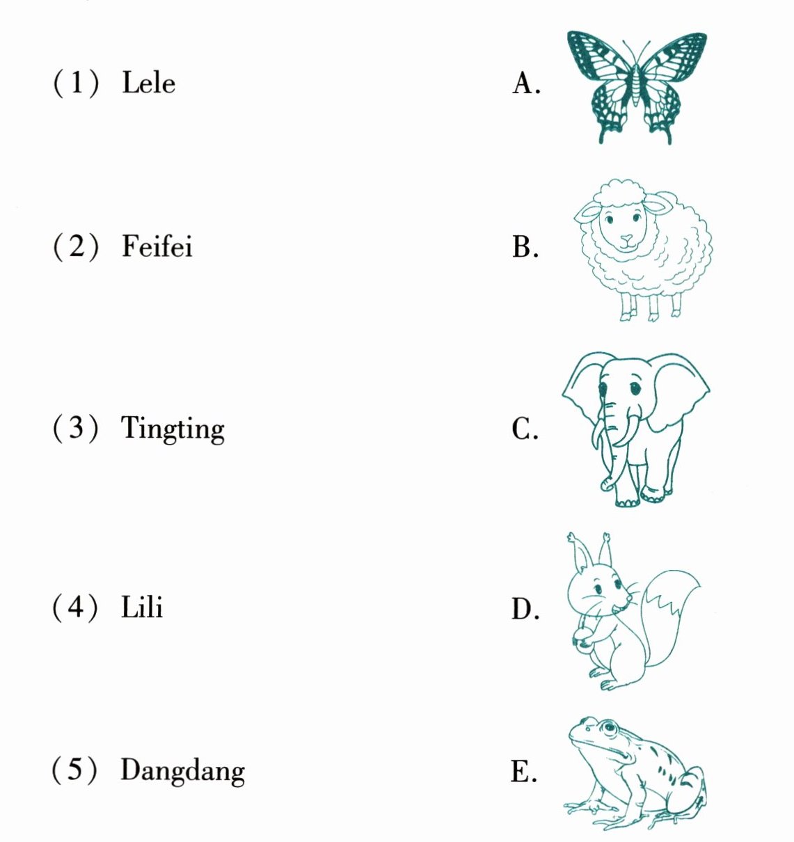 Lele likes frogs. He thinks (认为) they can help the crops. Feifei likes butterflies, because (因为) they are beautiful. Tingting like squirrels. She likes their big long tails. Lili likes sheep. She thinks they are quiet. Dangdang likes elephants. He thinks they are cute and friendly (友好的).