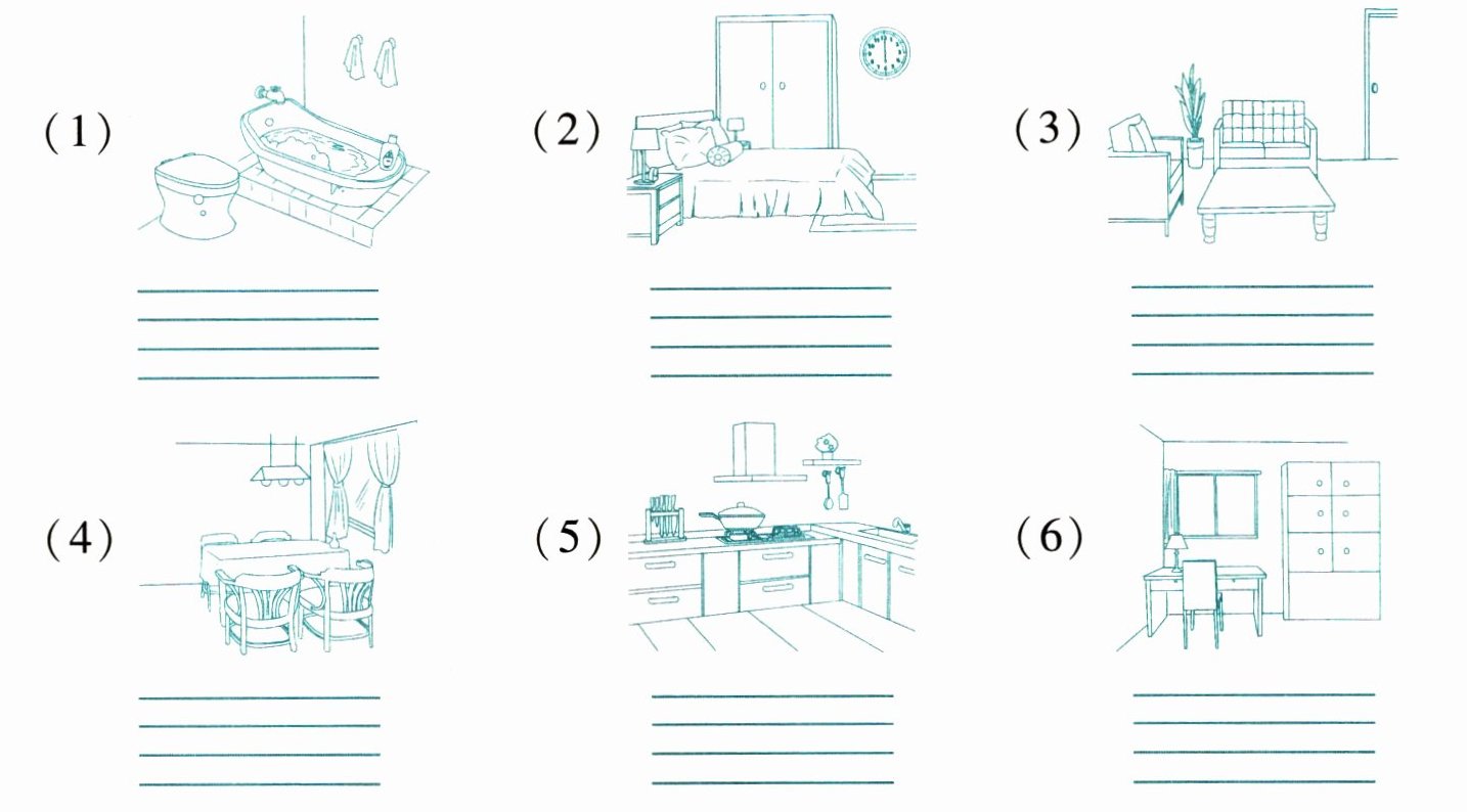1 乐乐在旅行软件上浏览民宿的宣传图片。根据图片把对应的房间名称写在四线三格内。