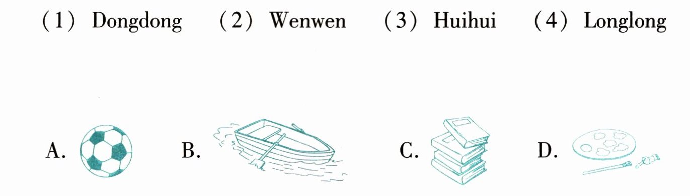 During my holiday, I make some new friends. This is Dongdong. He likes reading books. This is Wenwen. He likes painting. This is Huihui. He likes rowing a boat. This is Longlong. He likes playing football.