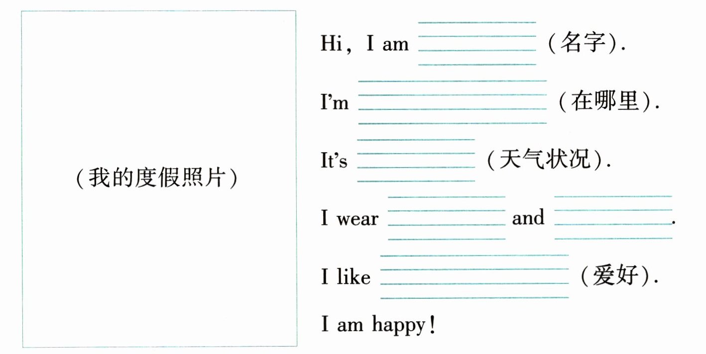 【解析】:这是一道英语描述任务题,主要考查学生对英语基本句型的运用能力,以及对于度假相关词汇的掌握。题目给出了一个描述框架,需要学生根据自己的实际情况或者想象,填入合适的内容。