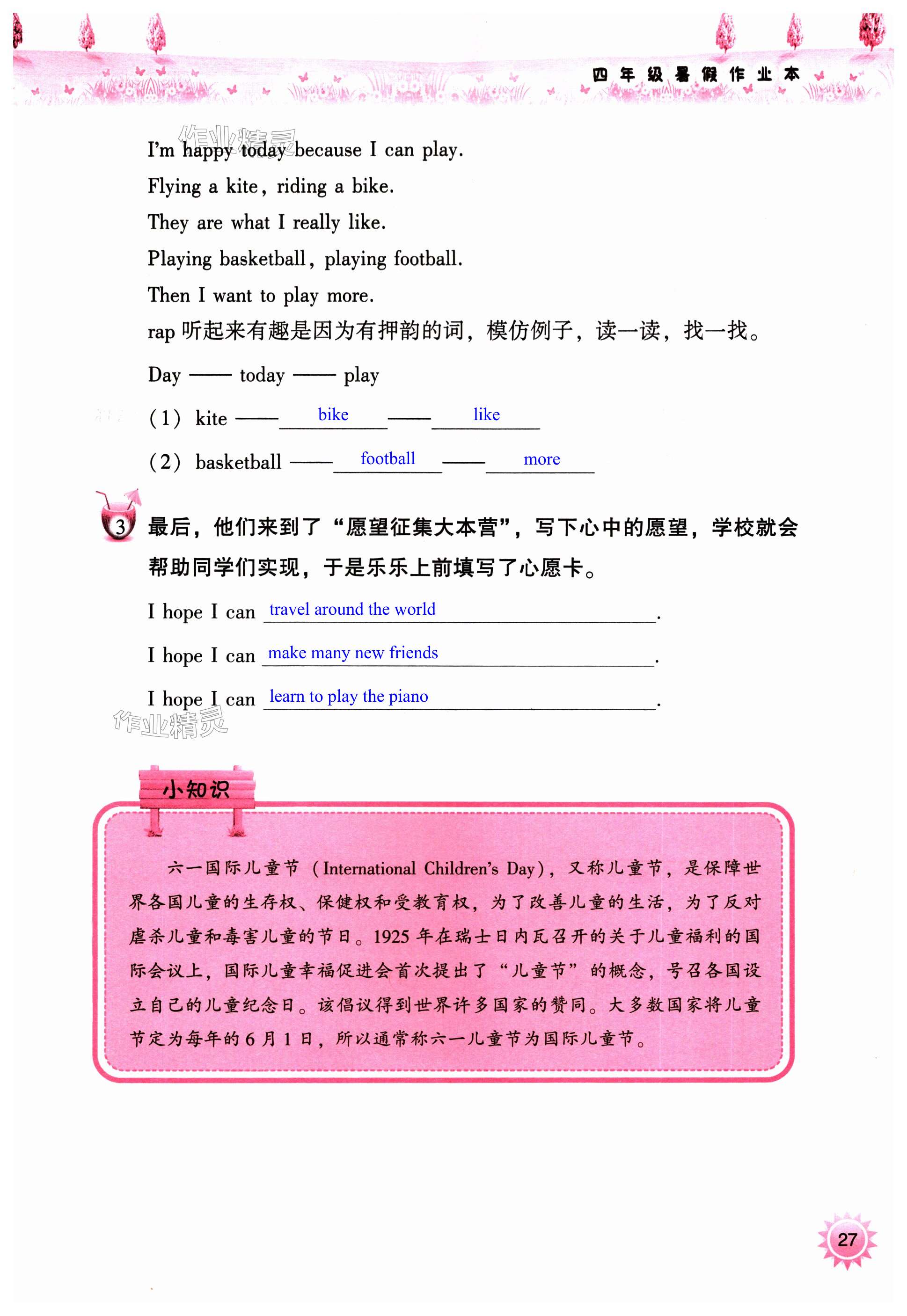 注:目前有些书本章节名称可能整理的还不是很完善,但都是按照顺序排列的,请同学们按照顺序仔细查找。练习册 2025年暑假作业本希望出版社四年级英语沪教版 答案主要是用来给同学们做完题方便对答案用的,请勿直接抄袭。