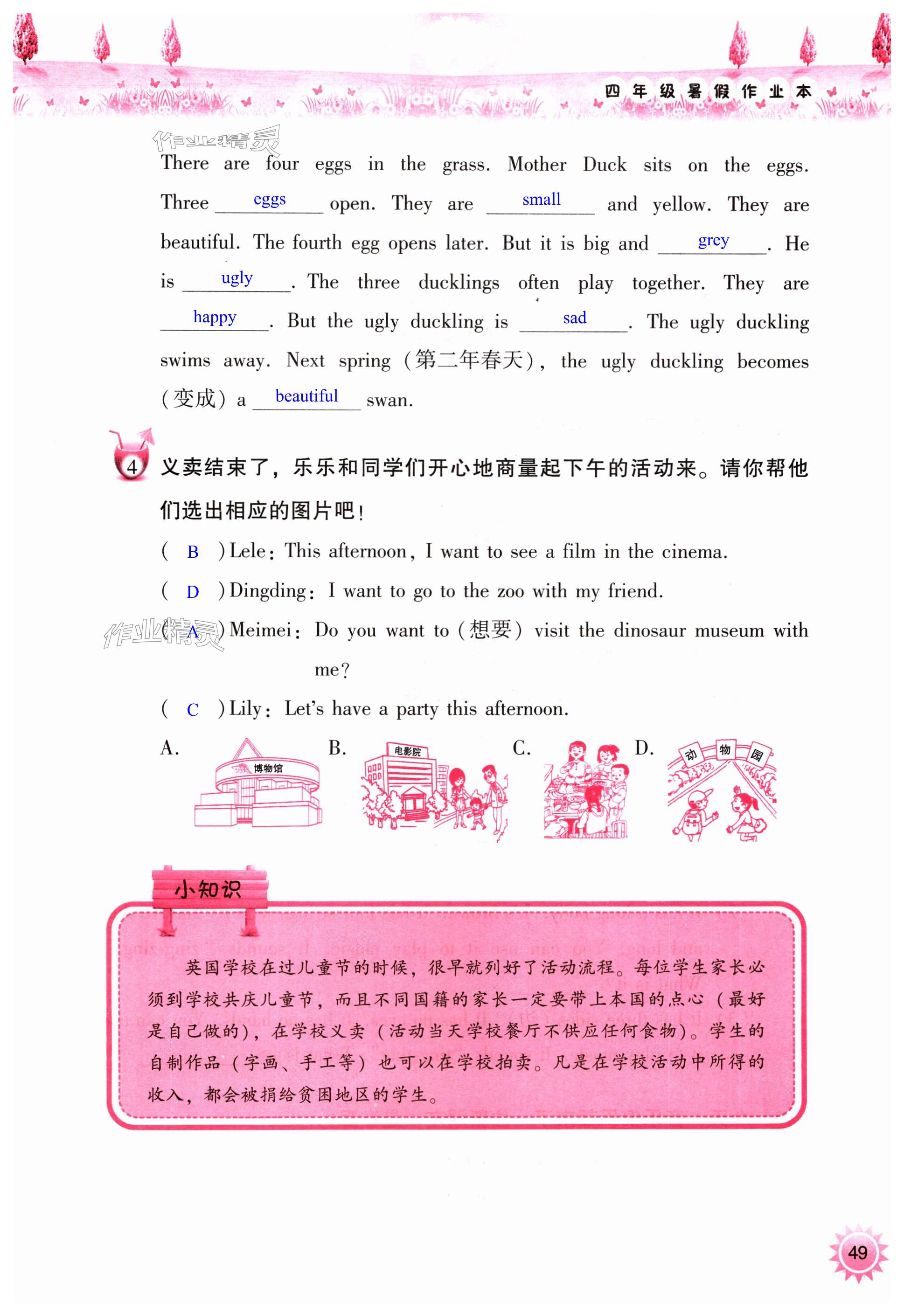 注:目前有些书本章节名称可能整理的还不是很完善,但都是按照顺序排列的,请同学们按照顺序仔细查找。练习册 2025年暑假作业本希望出版社四年级英语沪教版 答案主要是用来给同学们做完题方便对答案用的,请勿直接抄袭。