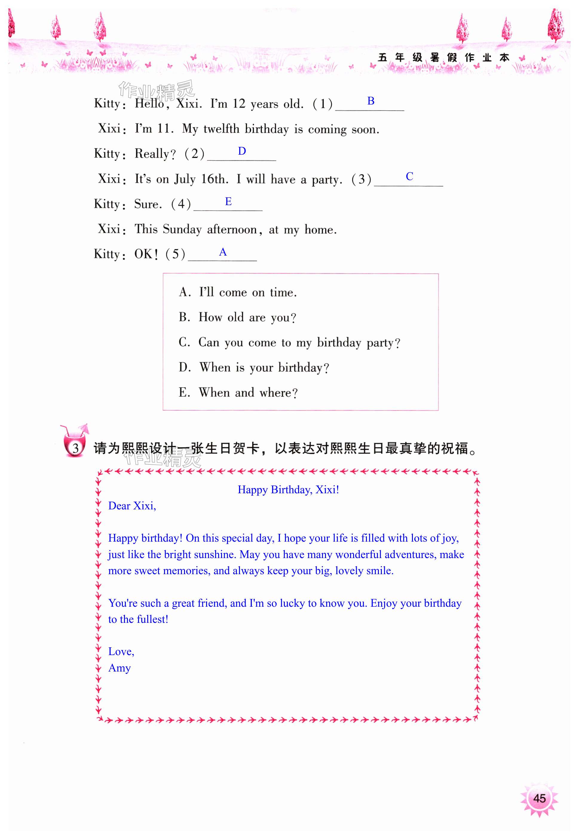 注:目前有些书本章节名称可能整理的还不是很完善,但都是按照顺序排列的,请同学们按照顺序仔细查找。练习册 2025年暑假作业本希望出版社五年级英语沪教版 答案主要是用来给同学们做完题方便对答案用的,请勿直接抄袭。