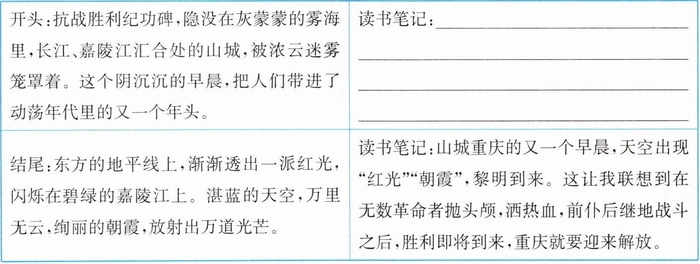 | 结尾:东方的地平线上,渐渐透出一派红光,闪烁在碧绿的嘉陵江上。湛蓝的天空,万里无云,绚丽的朝霞,放射出万道光芒。 | 读书笔记:山城重庆的又一个早晨,天空出现“红光”朝霞,黎明到来。这让我联想到在无数革命者抛头颅,洒热血,前仆后继地战斗之后,胜利即将到来,重庆就要迎来解放。 |