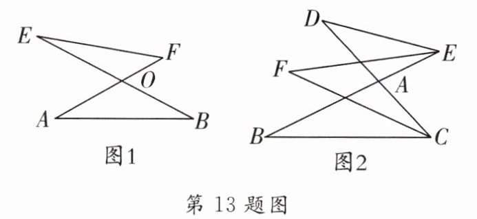 13.(1)如图1所示,AF与EB交于点O,我们将$△EOF与△AOB$称为对顶三角形.求证:$∠A+∠B= ∠E+∠F.$