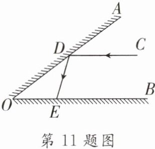 11. (湖南中考)如图所示,∠AOB的一边OA为平面镜,∠AOB= 38°,一束光线(与水平线OB平行)从点C射入经平面镜反射后,反射光线落在OB上的点E处,则∠DEB的度数是______
