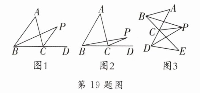 19. (8分)【探究发现】如图1所示,在△ABC中,点P是内角∠ABC和外角∠ACD的角平分线的交点. 试猜想∠P与∠A之间的数量关系,并证明你的猜想.