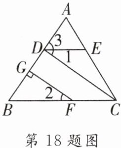 18. (8分)如图所示,∠1= ∠2,∠3= ∠B,FG⊥AB于点G,猜想CD与AB的位置关系,并证明你的猜想.