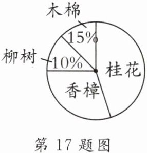 17.(9分)为了实施校园文化战略,提升校园文化品位,在“回赠母校一棵树”活动中,某市某中学准备在校园空地上种植桂花树、香樟树、柳树、木棉树.为了了解学生喜欢的树种情况,随机调查了该校部分学生,并将调查结果整理后制成了如图所示的统计图,且喜欢桂花树的有80人,喜欢柳树的有20人.