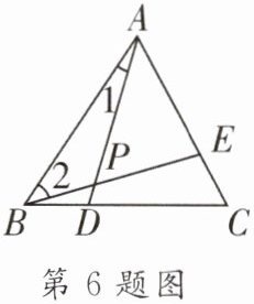 6. 如图所示,在等边△ABC中,D,E分别是BC,AC上的点,且BD= CE,AD与BE相交于点P,则∠1+∠2的度数是 (