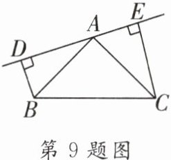 9. 如图所示,在Rt△ABC中,∠BAC= 90°,AB= AC,分别过点B,C作经过点A的直线的垂直线段BD,CE,若BD= 3厘米,CE= 4厘米,则DE的长为__