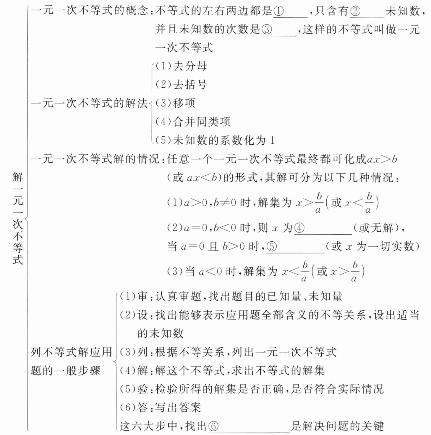 ①整式 ②一个 ③1 ④一切实数 ⑤无解 ⑥不等关系