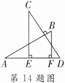 14. 如图所示,$AB \perp CD$,且$AB = CD$.$E$,$F是AD$上两点,$CE \perp AD$,$BF \perp AD$.若$CE = a$,$BF = b$,$EF = c$,则$AD$的长为