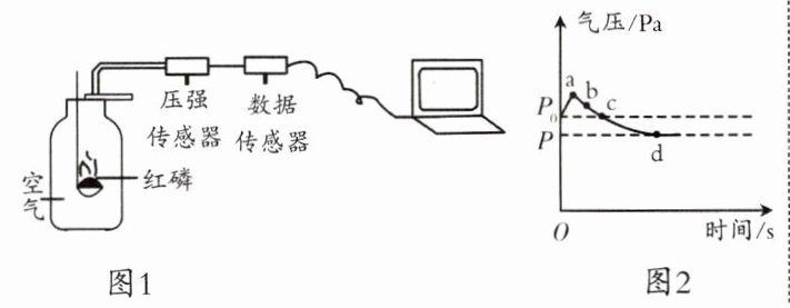 5. 图1所示装置可用于测定空气中氧气的含量,图2是用该装置测得实验过程中集气瓶内气压与时间关系图(该装置气密性良好,P₀是集气瓶内初始气压)。下列说法正确的是(