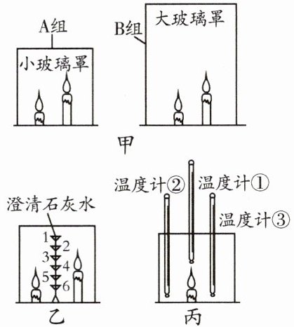实验二:将3支温度计分别挂在小玻璃罩内不同位置(如图丙所示),点燃蜡烛,一段时间后发现温度计①示数明显增大,温度计②③示数增大不明显。