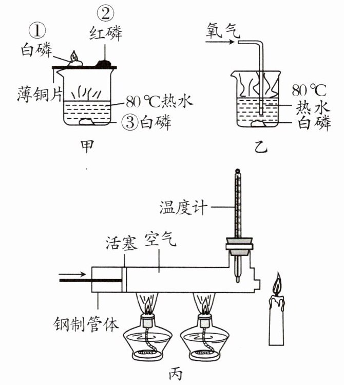(3)已知蜡烛的着火点约为190℃,蜡烛的火焰由气态蜡燃烧形成。如图丙所示,在温度计示数为280℃以上时,快速推动活塞,观察到蜡烛立即熄灭。蜡烛熄灭的主要原因是