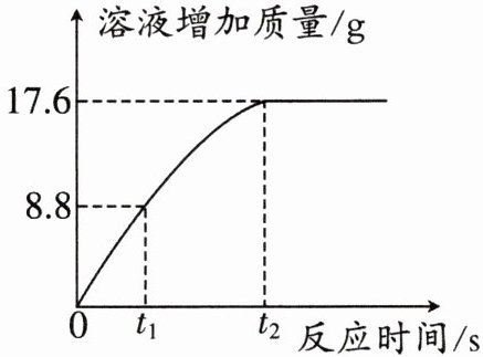 24.(2023·永州改编)某化学兴趣小组通过实验测定石灰石中$CaCO_3$的含量(假定石灰石中只含有$CaCO_3$以及不与稀盐酸反应的杂质)。将50g石灰石加入到过量的稀盐酸中,产生的$CO_2$气体通入到足量的NaOH溶液(NaOH溶液与$CO_2$反应生成水和溶于水的$Na_2CO_3)$中,测量NaOH溶液增加的质量变化如图。