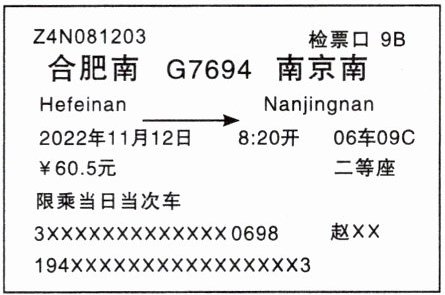 (1)如果你 11 月 12 日到合肥高铁南站做实习播音员,请按照下图的车票,提醒乘客检票上车。