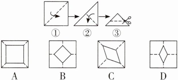 2. 将一张正方形纸片按下图步骤①,②沿虚线对折两次,然后沿③中平行于底边的虚线剪去一个角,展开铺平后的图形是(