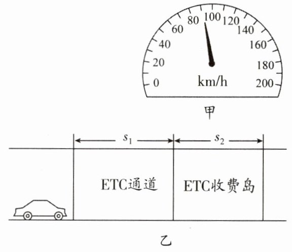11. 一辆汽车在某高速公路上以如图甲所示的速度匀速行驶10 min后到达收费站,在进入图乙ETC收费岛区域前$s_1= 60 m$处开始减速,经$t_1= 5 s$后运动至ETC收费岛边界,然后再以5 m/s的速度匀速通过ETC收费岛,其通过的路程长$s_2= 25 m.$不计车长,求: