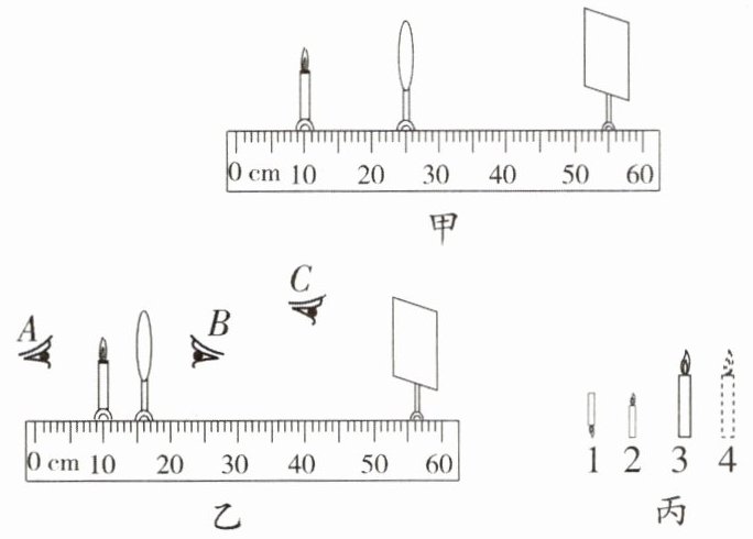 (填“A”“B”或“C”)处能观察到蜡烛的像,像是图丙中的4