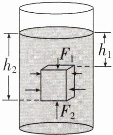 16. 如图,一棱长为10cm的实心正方体悬浮在液体中,已知$h_{1}= 10cm$,其上表面受到液体向下的压力$F_{1}= 8N$,则以下说法正确的是 (