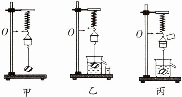 (3) 如图丙所示,把小水杯中的水全部倒入弹簧下方的小桶中,弹簧的下端又会到达原来的位置O,将此时弹簧对小桶的拉力记为$T_{2}$,则$T_{2}$__