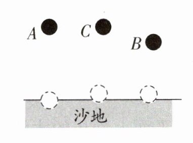 15. 如图所示,在“探究影响重力势能大小的因素”实验中,有三个实心的、大小相同的铁球 A、铁球 B 和塑料球 C.球 A、C 离沙地高度相同.现让三个球同时由静止释放,球落到沙地上的状态如图中虚线所示.