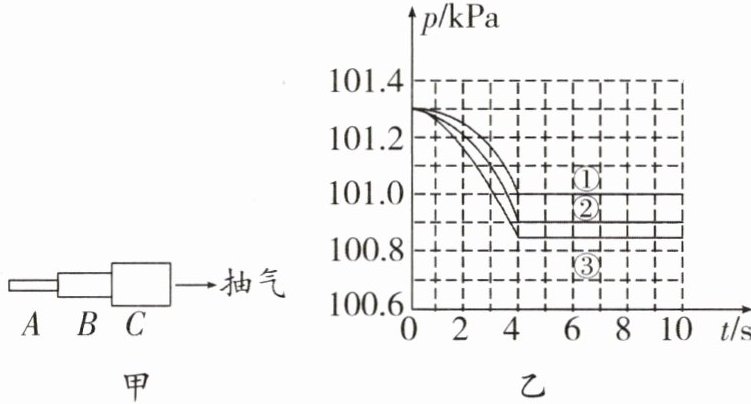 9. 物理老师在实验室做“流体压强与流速关系”的演示实验:图甲所示的是由粗细不同的三节塑料管A、B、C连接而成的装置,三节管中分别接有三个相同传感器的探头,传感器与电脑相连。老师将抽气机与C管右端相连后开始抽气,电脑绘制出的三节管中的气体压强随时间变化的p-t图像如图乙所示。则下列描述正确的是(