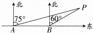 7. 如下图,一艘轮船自西向东航行,在$A处测得小岛P在北偏东75^{\circ}$方向上,航行$7n mile后到达B$处,在$B处测得小岛P在北偏东60^{\circ}$方向上。若小岛$P周围3.8n mile$内有暗礁,则该轮船继续向东航行,是否有触礁的危险?请说明理由。