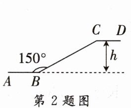 2. 如图所示的是某商场一楼与二楼之间的自动扶梯示意图,其中$AB$,$CD$分别表示一楼、二楼地面的水平线。若$\angle ABC = 150^{\circ}$,$BC$的长是$15m$,则乘自动扶梯从点$B$到点$C$上升的高度$h$是(