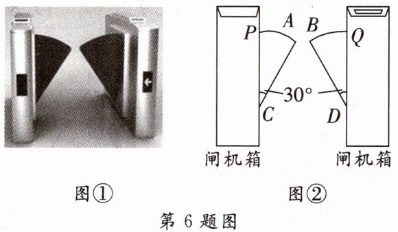 6. 如图①所示的是某超市入口的双翼闸门,它的平面示意图如图②所示。当它的双翼展开时,双翼边缘的端点$A与B之间的距离为10cm$,双翼的边缘$AC = BD = 54cm$,且与闸机侧立面的夹角$\angle PCA = \angle BDQ = 30^{\circ}$。当双翼收起时,可以通过闸机的物体的最大宽度为______$cm$。
