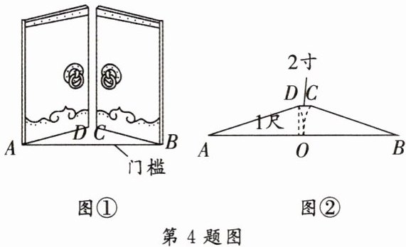 4. (广西中考)《九章算术》是古代东方数学代表作,书中记载:今有开门去阃一尺,不合二寸. 问门广几何. 题目大意是如图①,②(图②为图①的平面示意图),推开双门,双门间隙 CD 的距离为 2 寸,点 C 和点 D 距离门槛 AB 都为 1 尺(1 尺= 10 寸),则 AB 的长为( )
