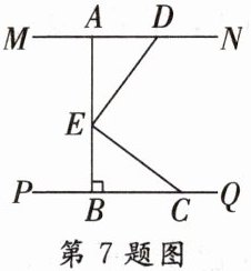 7. 如图,$MN// PQ$,$AB⊥PQ$,点$A$,$D在直线MN$上,点$B$,$C在直线PQ$上,点$E在AB$上,$AD + BC = 7$。若$AD = BE$,$DE = EC$,则$AB$的长为______